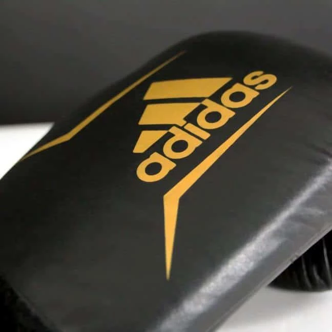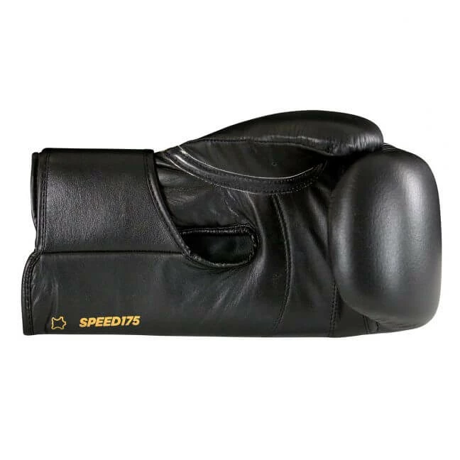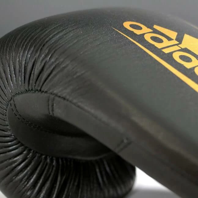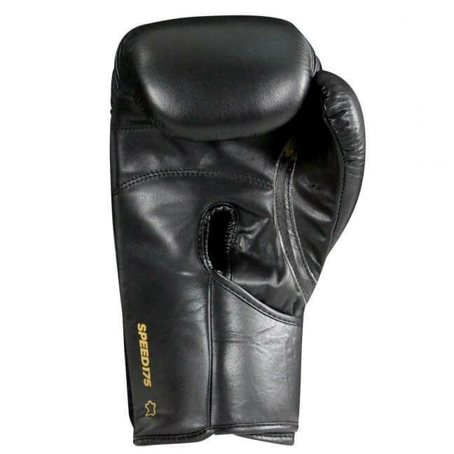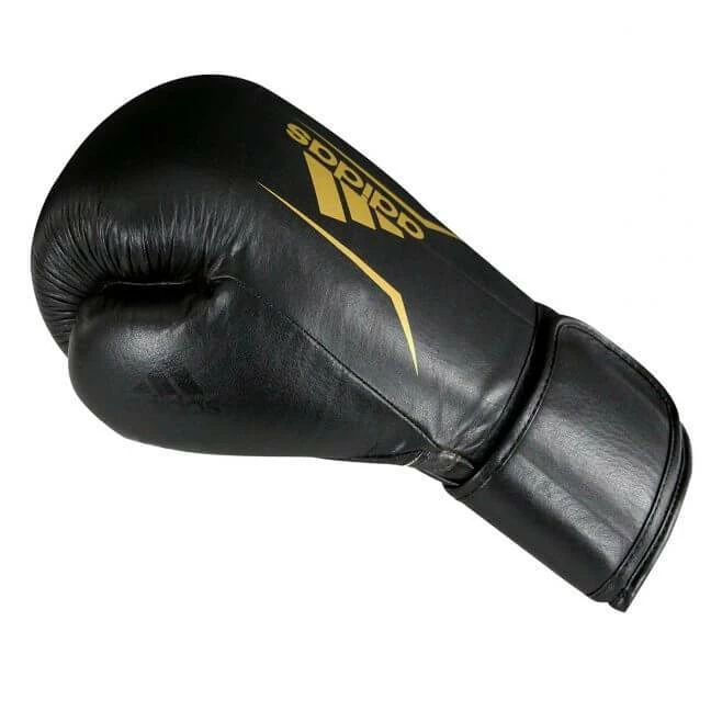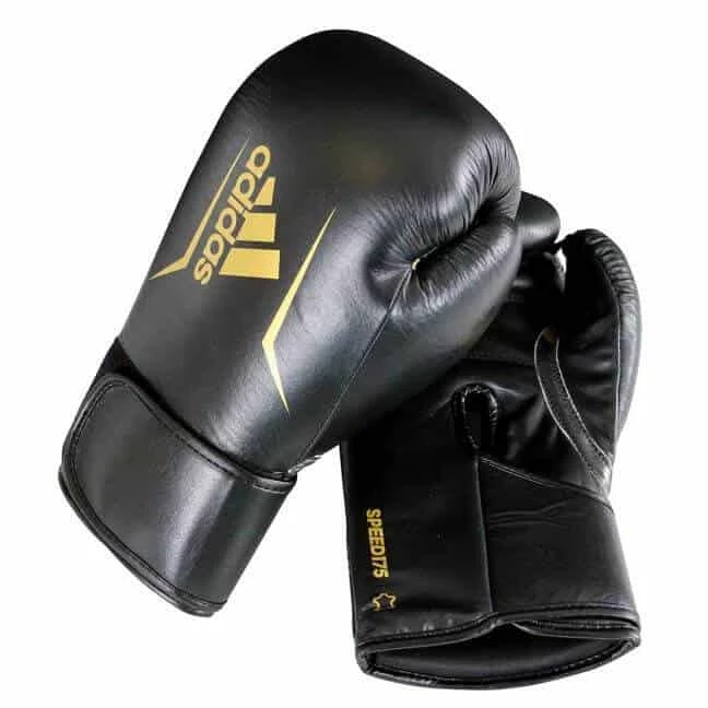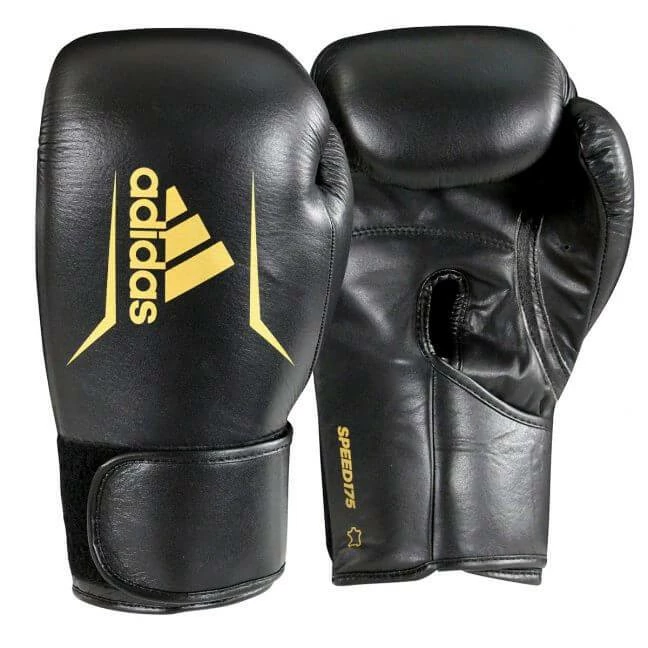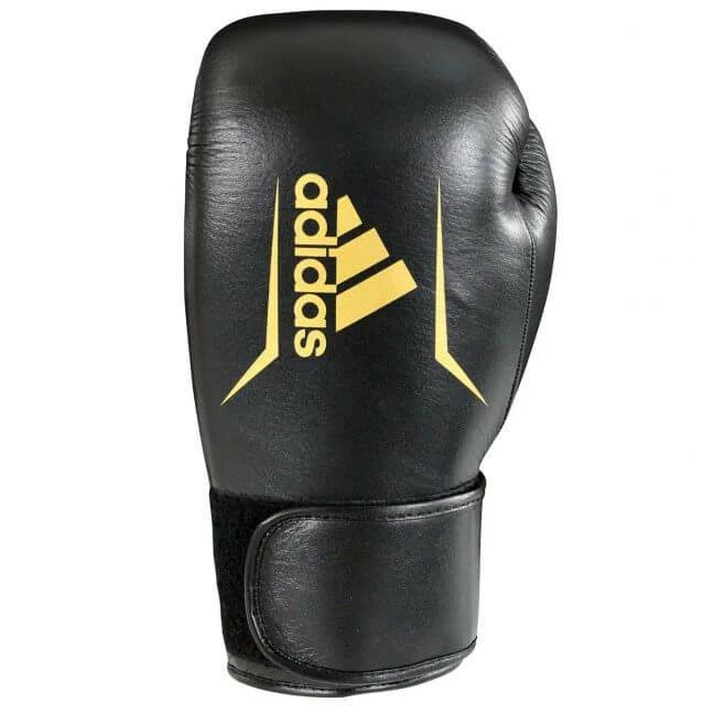 - Gold adidas logo on fron and black adidas logo on thumb Take your gloves to the next level with this amazing full leather speed 175. You will notice the quality with an extremely comfortable fit and preformed fist.