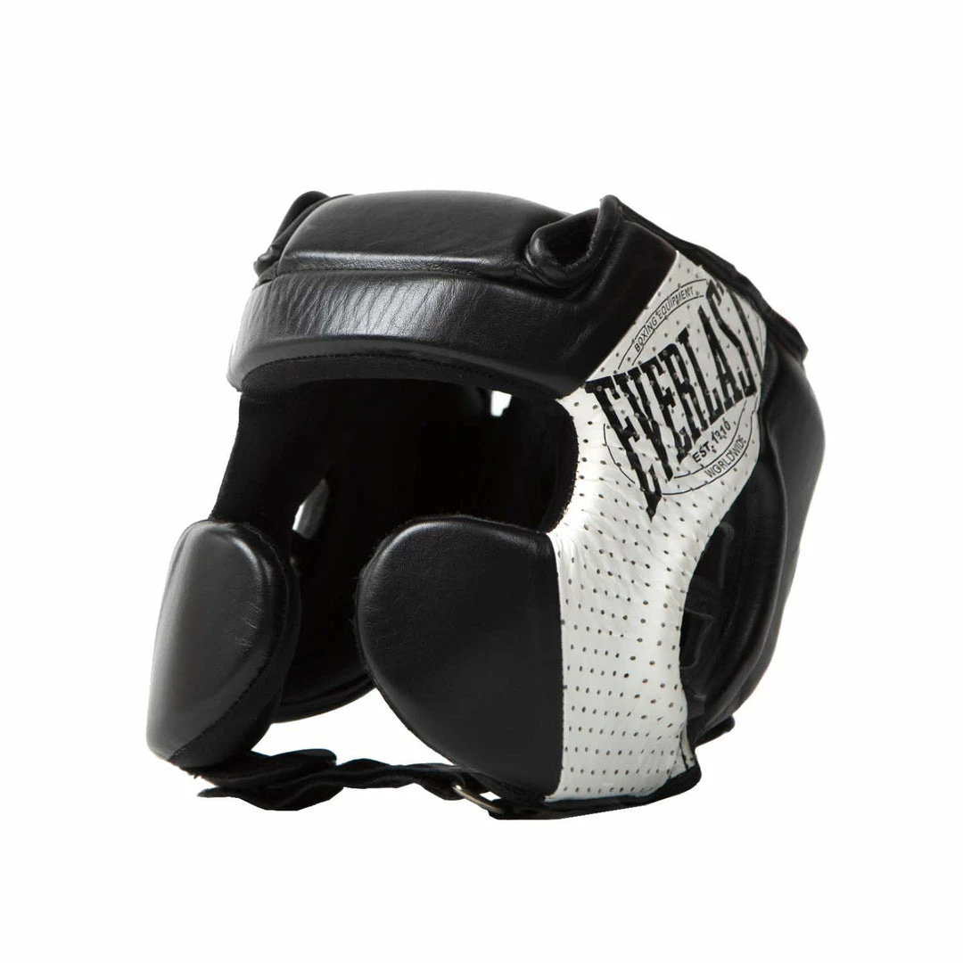The Everlast 1910 Headgear is the perfect combination of boxing heritage and modern-day advances in protection. Premium full grain leather construction resists moisture while providing optimal, long-lasting durability. The lightweight foam padding makes this headgear the perfect balance of protection and mobility. Easily slip the headgear on and off with hook-and-loop rear closure system. Adjustable lace forehead guard and buckle chin strap provide the ultimate in customizable fits. Specially designed cheek guards and integrated ear protection add ideal security and coverage without hindering line of sight or hearing. A modern take on a classic line, the Everlast 1910 Headgear is a must have for any fight connoisseur.
