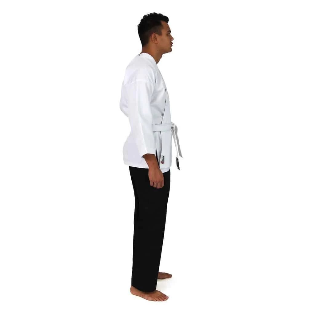 The SMAI Salt and Pepper Martial Arts Karate uniform follows a traditional design. With a white wrap around jacket the pants are then black with an elastic waist.