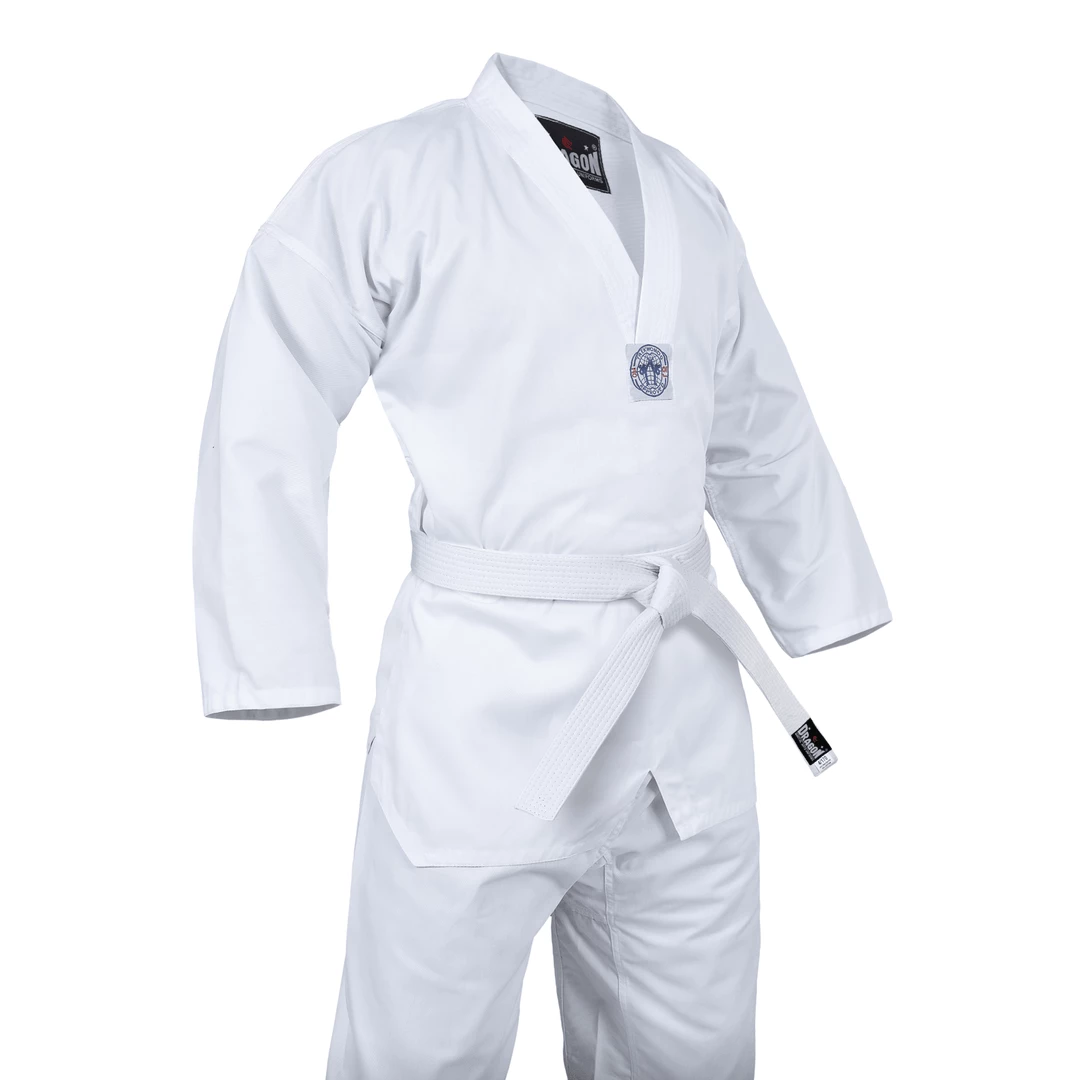 This Dragon lightweight 8oz student Taekwondo uniform is everything you want in an entry level gi. Our exclusive light-weight 8oz Taekwondo uniform puts other brands to shame. These high-quality lightweight student uniforms are made of a durable 8oz cotton/poly material and are built to last with extra stitching in the jacket and pants. Made using 35% cotton and 65% polyester ensures that these Dragon Taekwondo uniforms are soft on the skin, durable and require minimal ironing for day to day club training. Once you give our 8oz lightweight Taekwondo uniforms a try, we know you won’t ever want to wear anything else.