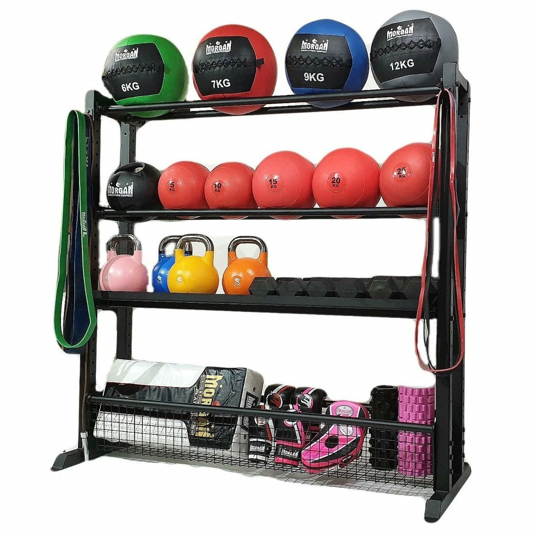THE MORGAN ENDURANCE STORAGE RACK The Morgan Endurance storage racking system is an all-encompassing racking solution designed for any training facility using a wide variety of functional fitness equipment products. Our storage racking system is designed as a 4 layer storage solution. The basket shelf area can hold all your smaller essentials like foam rollers, massage balls, focus pads and boxing gloves The heavy-duty shelf is designed to hold your kettlebells, dumbbells and heavier more solid products. The top and second rack are dual-pipe shelves designed to hold items like slam balls, wall balls, medicine balls, Storage pegs that can hold your power bands, weight belts and skipping ropes Our racking system is made from 4mm powder-coated steel, ensuring that the product will last a lifetime. The overall product dimensions are: Height = 158cm Length = 162cm Depth = 62cm