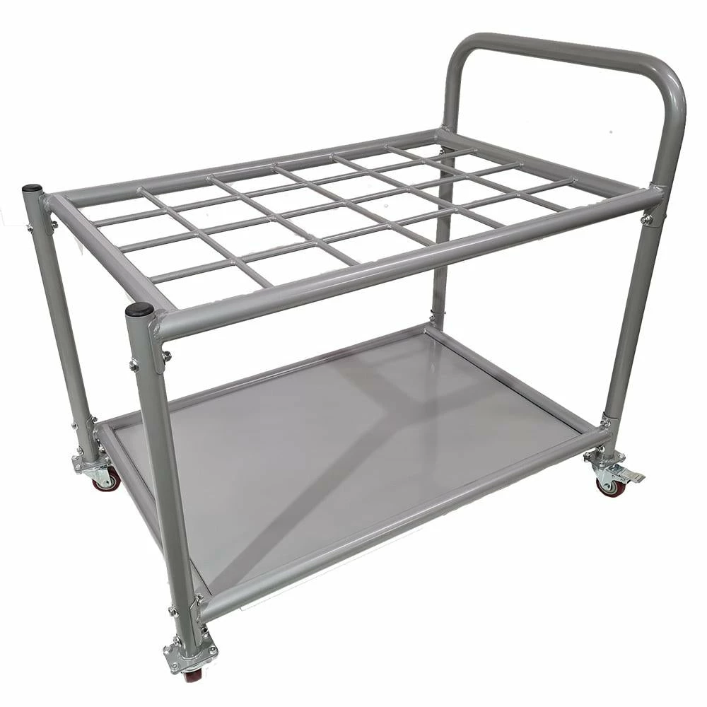 MORGAN FOAM ROLLER & EXERCISE MAT CART The Morgan Foam Roller & Mat Storage Cart is a high-quality storage solution for exercise mats, yoga mats and foam rollers. Ideal for studio or commercial use, the storage cart helps organise workout facilities of any size. With 24 x 15.5cm compartments laid out over an easy to push and pull cart layout. 4 bearing driven wheels, tubular steel construction and total product weight of 35kg makes this a great solid addition to your commercial training facility. 24 x 15.5cm storage compartments Ideal for foam rollers and exercise mats 4 x castor wheels for smooth movement 2 x rear wheels are lockable for stability and unwanted movement Dimensions: 1.07m(h) x 1.18m(l) x 0.78m(d)