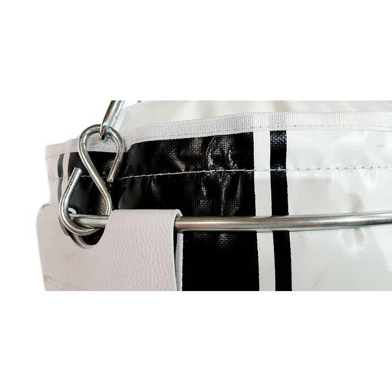 The Morgan V2 endurance punch bag is the essence of a true heavyweight punch bag, measuring 42cm in diameter and approx 50kg, makes this one of the widest punch bags available to purchase in Australia. Manufactured using our signature 1050D ripstop vinyl, with 4 x re-enforced leather holding patches with quad rivet layout over the holding patches to make sure the ring stays firm and secure over the life of the bag. Using our patent-pending Halo ring layout gives the bag a never sag finish towards the top, allows the bag to stay centred during workouts and gives the user and great training experience. Using our XL 42cm diameter reduces the bag swinging during training, and can allow for 2 people to use the bag at once. A 4 way rear tie-down strap located at the bottom of the bag, will help reduce the swinging motion of the bag if used, this stabilises the bag during training which is great for when the punching bag is used in a high traffic area. With an additional layer of Australian made medium density foam, wrapped around the highly compressed fleecy and cotton inner fill will provide all users with safe and enjoyable training experience.