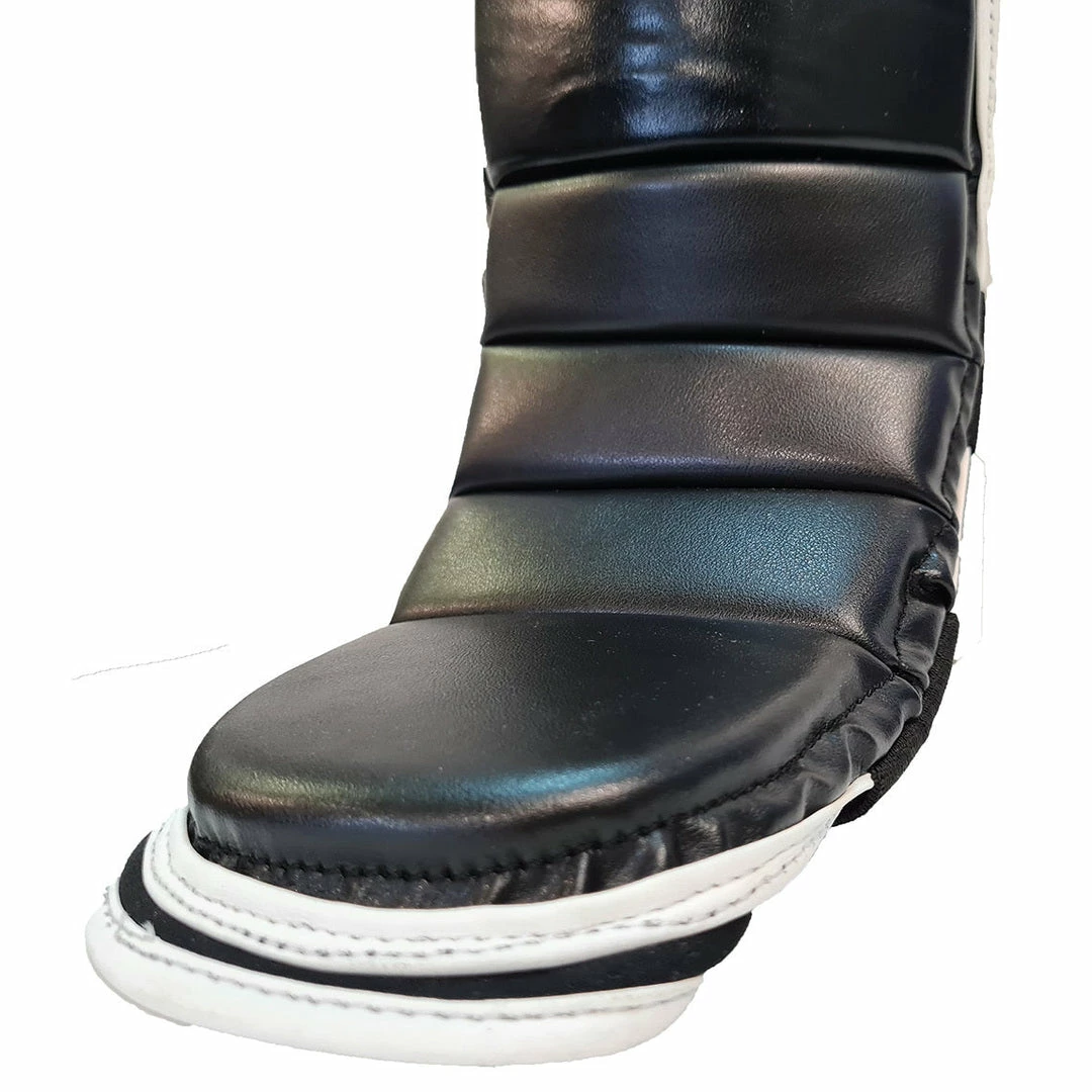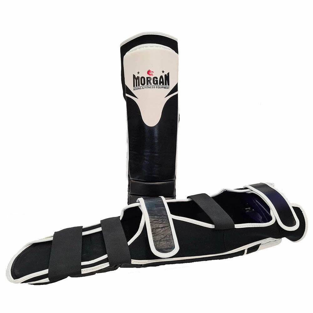 The Morgan MMA professional shin and instep protectors are made from synthetic rubbers that are produced by polymerisation of chloroprene and maintain flexibility over a wide range of temperatures and training environments. Using our signature phase 3 ATF grade Rexene outer covering helps provided unparalleled flexibility and prolongs the life of the shin guards during extensive groundwork training. The Shin guards feature elastic straps on top for a tight fit with hook and loop cover for maximum comfort, safety and less moving during training. A natural feel with U-SHAPE stitching over your tendon area and soft pads on foot protectors for added comfort.