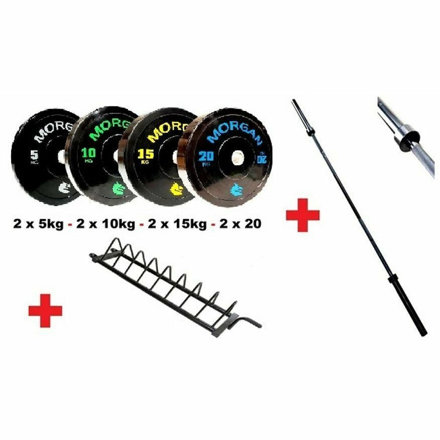 MORGAN WEIGHT LIFTING STARTER PACK The Morgan Weight Lifting Starter Pack is a must-have for beginners who want to get into weight lifting fast. The weight training set is the ultimate solution for any training area that requires a commercial 20kg barbell and 100kg bumper plates with the convenience and flexibility of transport and storage with the inclusion of bumper plate holding rack. When purchasing this pack, you will receive a total of 100kg premium Olympic bumper plates (2x5kg, 2x10kg, 2x15kg, and 2x20kg), and a 20kg commercial-grade Olympic barbell with a pair of spring collars, together with powder-coated steel multi-plate storage trolley that has ball-bearing driven wheels and an easy to grip handle. Our weight training packs are designed for heavy commercial application and constructed to last the test of time. 100KG MORGAN OLYMPIC BUMPER PLATE PACK: Bumper plate pack includes 1pr x 5kg + 1pr x 10kg + 1pr x 15kg + 1pr x 20kg = 100kg An equal 450mm outer diameter Weights are in KG Solid natural virgin rubber Chemically bonded 10mm thick steel insert Shore Harness of 75 – 90 SHa for superior bounce reduction and safety 50.5mm centre hole 10mm bonded steel inserts 20KG BLACK HARDEN CHROME BARBELL: Weight: 20KG Maximum Load: 680kg Diameter: 28MM Centre knurl: No Tensile Strength: 190K Sleeve: Precision Ground Steel with a Black Hard Chrome non-slip coating System: 4 x Bearing per sleeve Length: 2200MM Shaft: Black Hard Chrome Coating MORGAN BUMPER PLATE ‘TOASTER’ RACK TROLLEY: Made from powder-coated steel Easy-grip handle 2 x wheels for easy transportation around gyms Ideal for those who need to move their weights from one location to another 8 x bumper plate inserts to hold either standard or IWF spec plates DW = 18kg Dimensions: 1.30m (length) x 30cm (wide) Plate inserts = 13cm wide (8 x inserts) For Superior bounce reduction and safety: 50.5mm centre hole 10mm bonded steel inserts