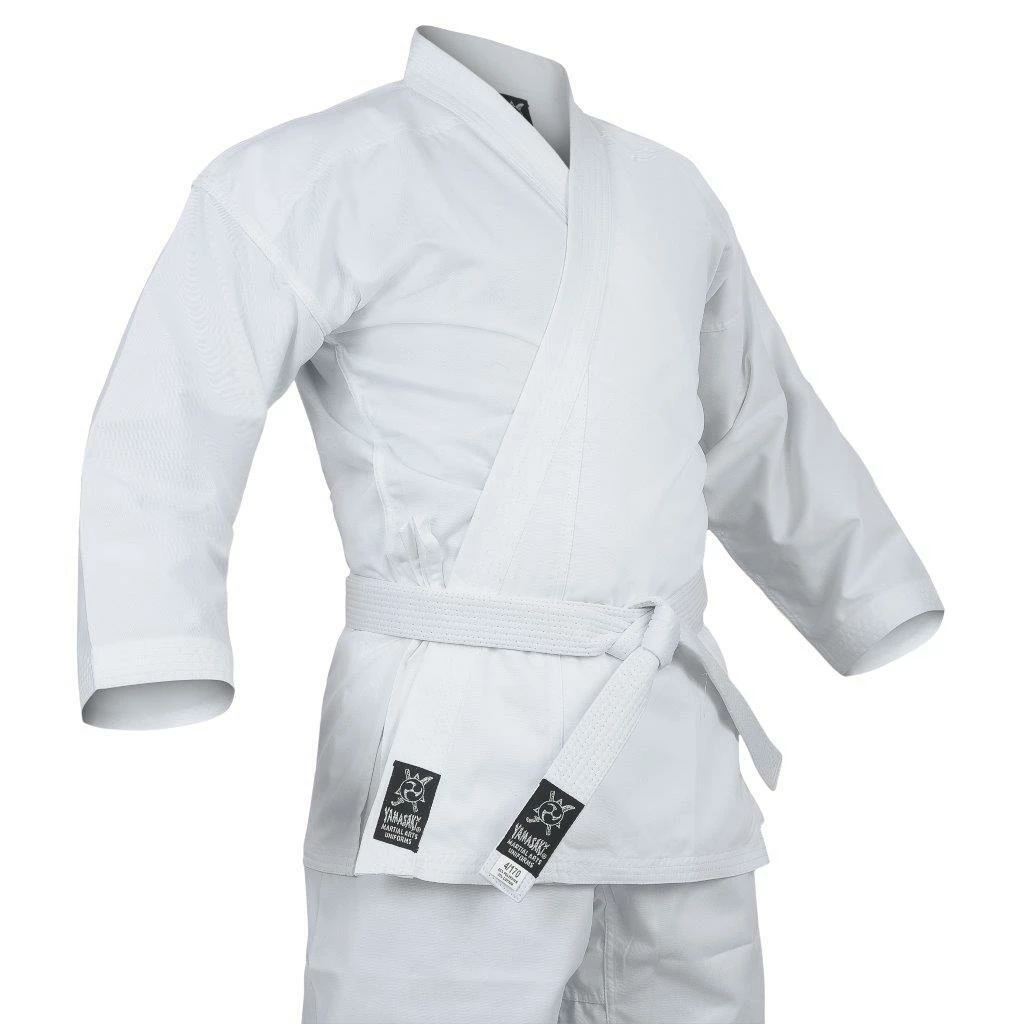 The Yamasaki 10oz Pro Uniform is a white training uniform that is designed for Karate practitioners who wish to perform kata or any other skit during class. The 10 oz fabric will make its wearer feel comfortable. This uniform is designed for advanced karate practitioners who are looking for a more traditional design.