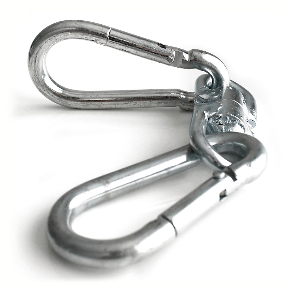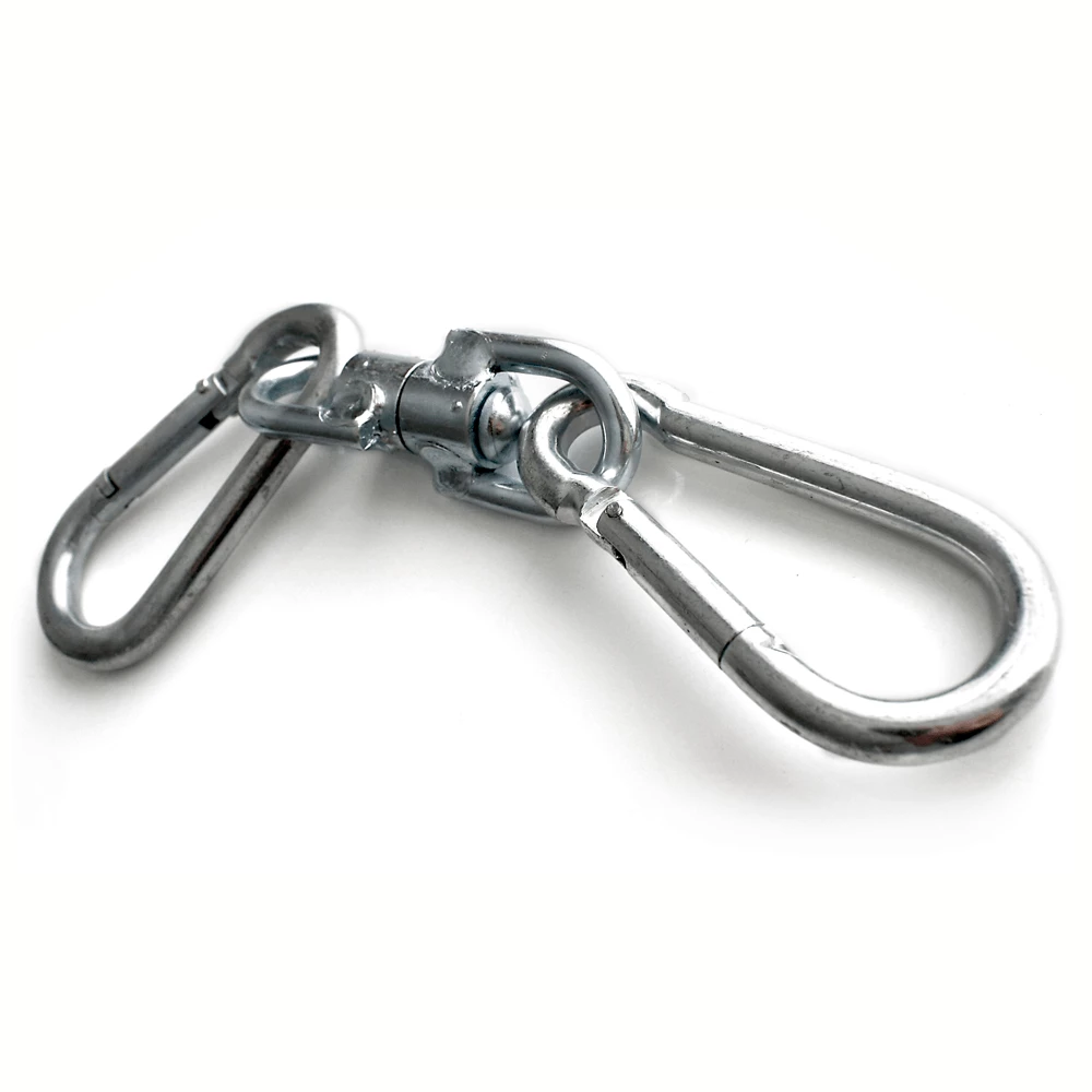 The Bag Swivel with snap hooks is used for attaching a boxing bag to a ceiling hook.