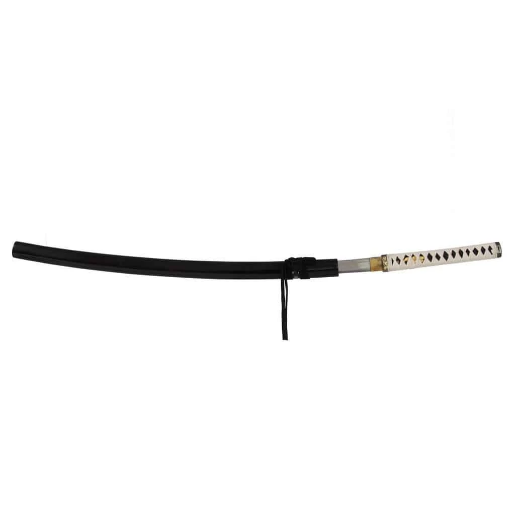 The Carbon Katana with its high quality black and white design, features a hamon and handle, blood groove and quality fittings. The blade is razor sharp, suitable for live cutting. The Black saya also conceals a second blade, which measures 19.5cm in length.