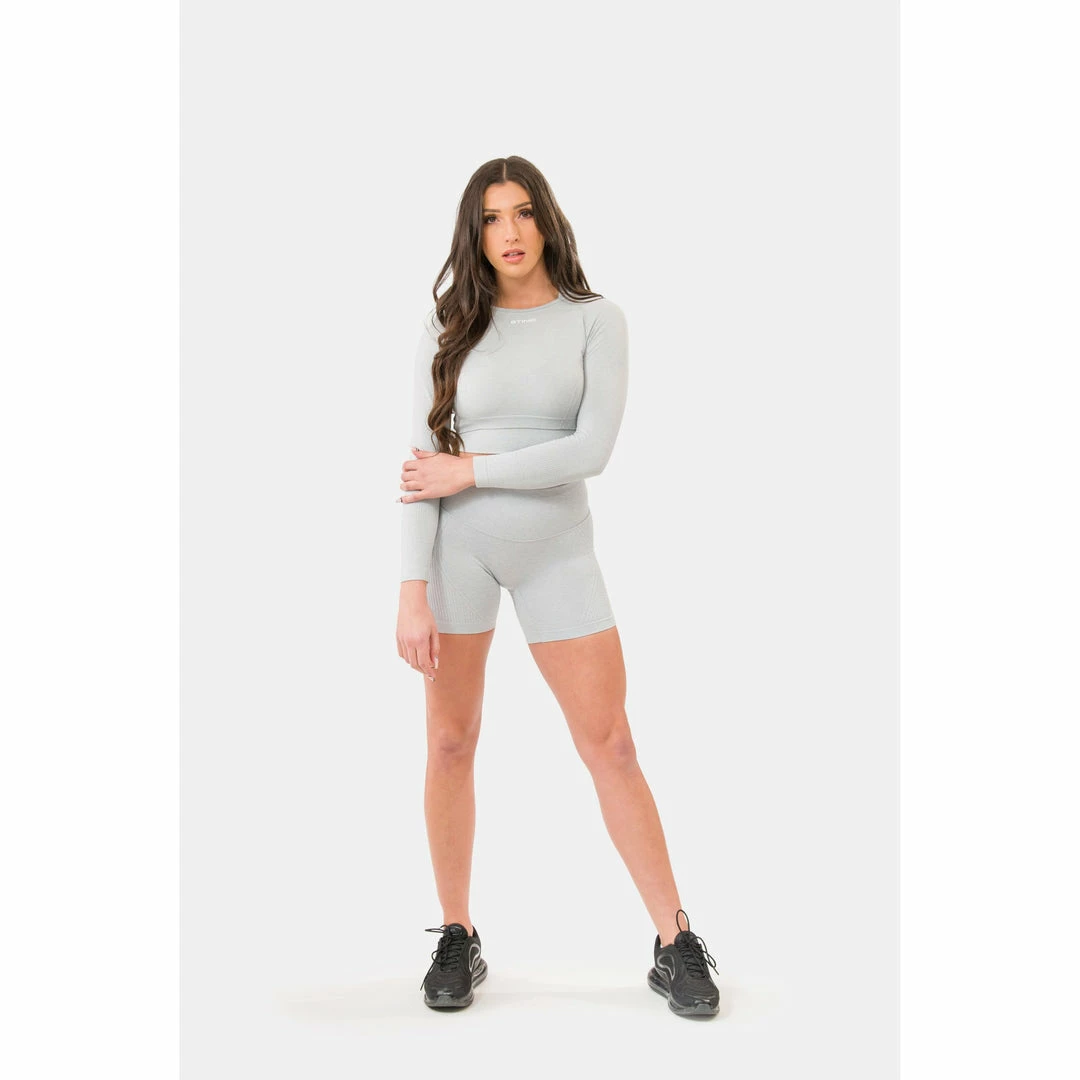 Model Size: Model is 5’.9” (approx. 175 cm) tall and is wearing size S in shorts and size M in seamless long sleeve