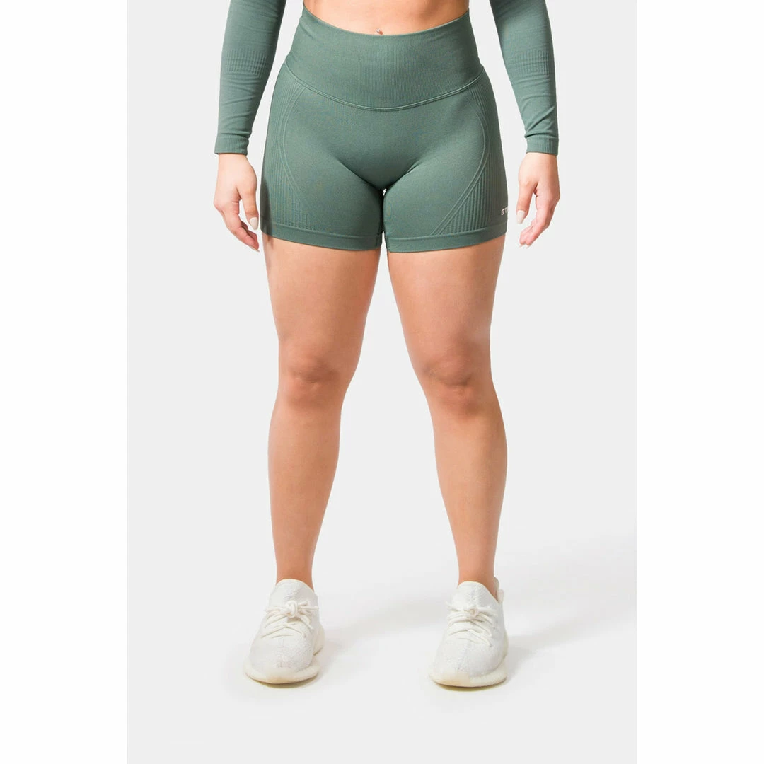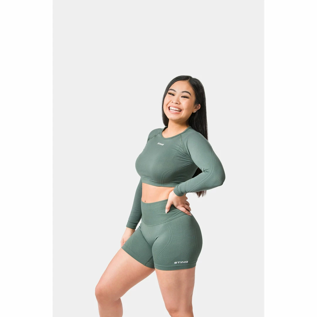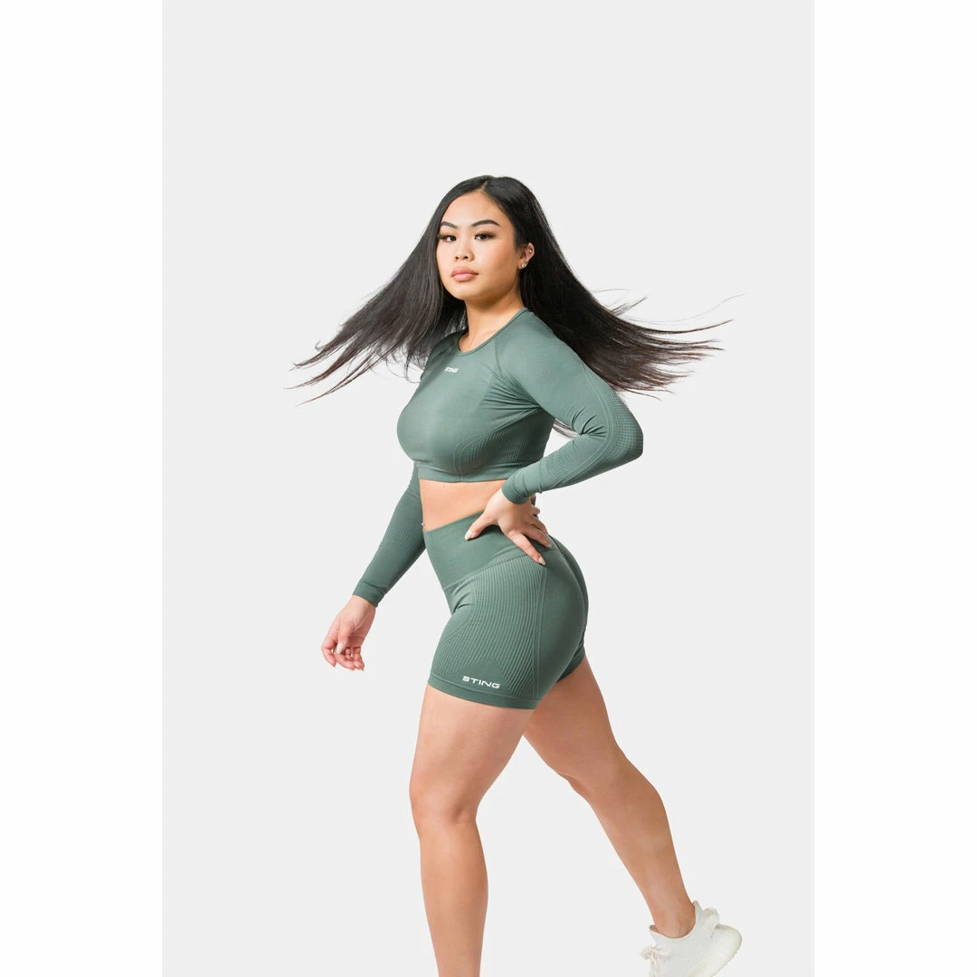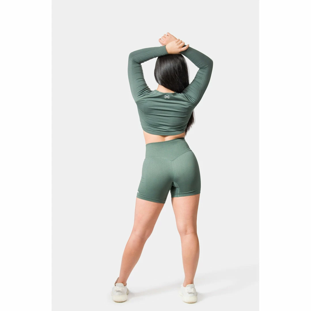 Model Size: Model is 5’.2” (approx. 157 cm) tall and is wearing size S in shorts and size S in seamless long sleeve