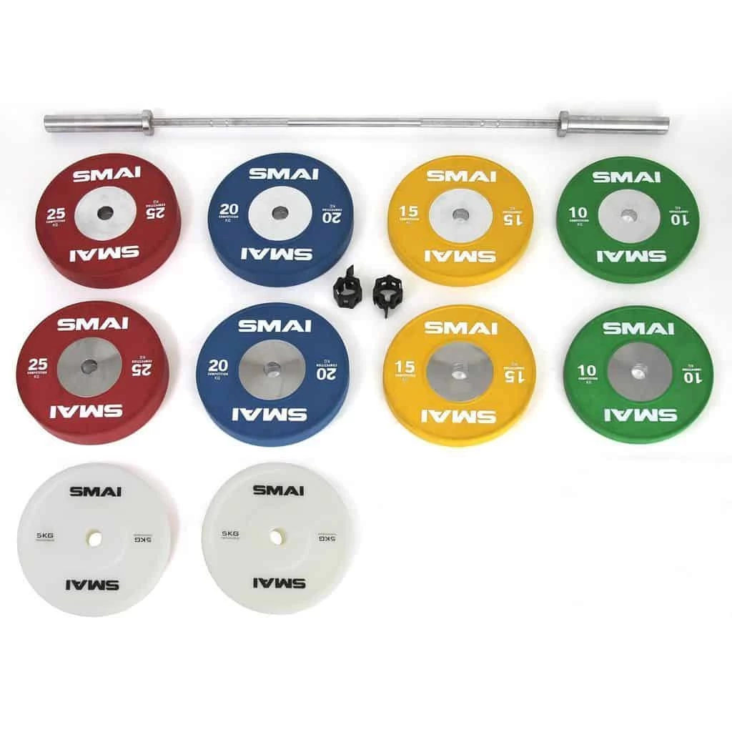 The SMAI 150kg Olympic Lifter’s Package is the ultimate pack to build a complete Olympic lifting setup. Including one of our elite bearing barbells (of your choice) and a 150kg set of our Competition Bumper Plates. This is the best lifting gear on the market – made to last, whether you’re setting up in your garage or adding a new platform to your gym.